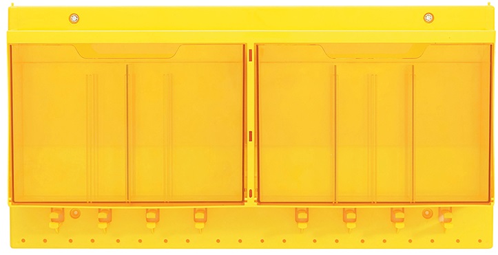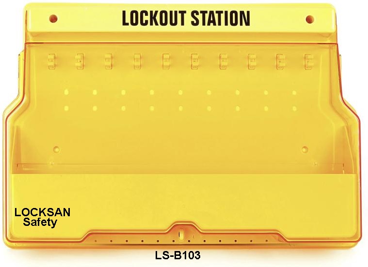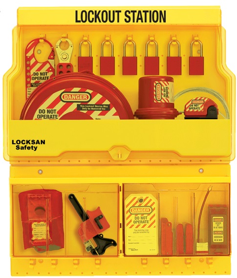 16 asma kilit pozisyonu ile, her pozisyon 2 asma kilidi barındırabilir; yanında asma kilitler, çeşitli etiketler, kablo tikleri, vb.